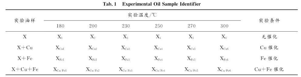 量取 150mL X 放入高溫高壓反應釜中,快速升溫至實驗溫度( 180 , 200 , 230 , 250 , 270 , 300℃ ),在此基礎上,添加確定的金屬片,在不同溫度下反應 2h ,反應結束后置于冰水浴中冷卻至室溫,取出反應釜中的實驗油樣待用 .金屬片為鐵片和銅片,尺寸為17mm×12mm×1mm.在金屬片添加前,經(jīng)過碳化硅砂紙的打磨,然后浸潤于異辛烷溶劑中,貯存?zhèn)溆茫褂脮r,用脫脂棉擦去表面上的溶劑,將其置于潤滑油中,避免金屬表層立即氧化而影響高溫模擬氧化實驗.反應油樣的編號列于表1.