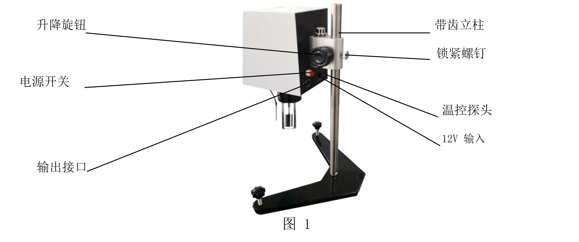 4、把粘度計機頭的升降夾頭裝在立柱上(如圖一),旋動升降旋鈕,使粘度計機頭能上下移動。若發現升降旋鈕